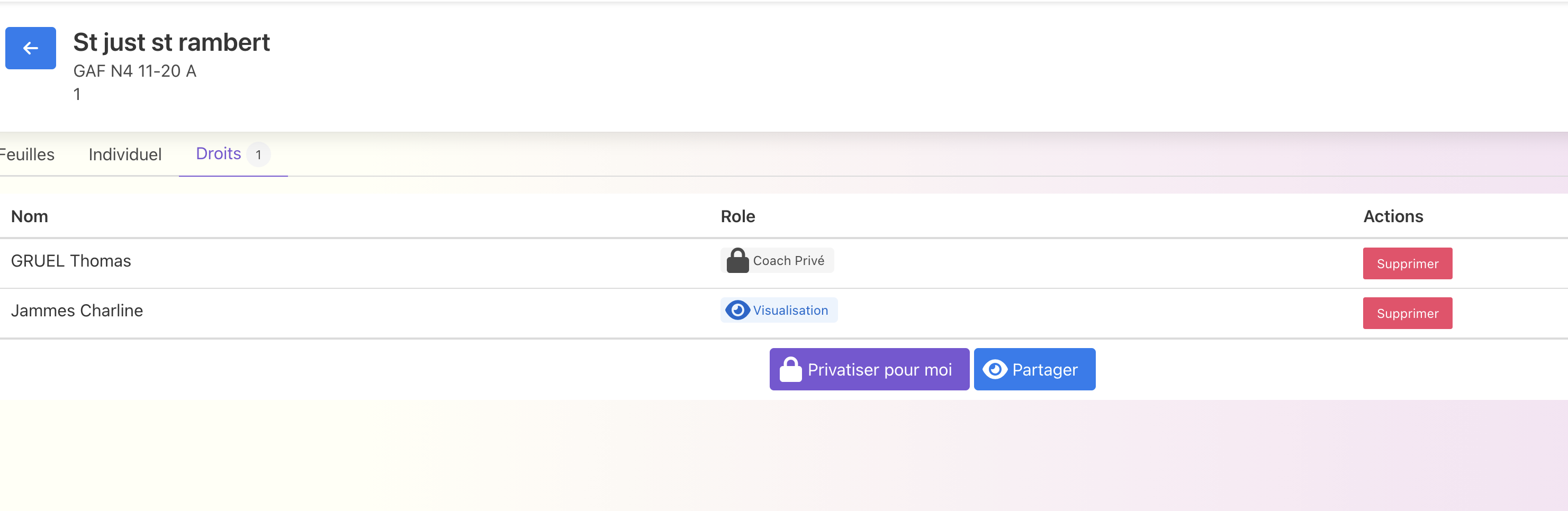 Effet : En cliquant sur ce bouton, vous devenez l'unique détenteur des droits d'accès sur cette équipe. Les autres membres (même du même club) ne pourront plus la visualiser, sauf si vous les ajoutez manuellement via la fonction de partage.